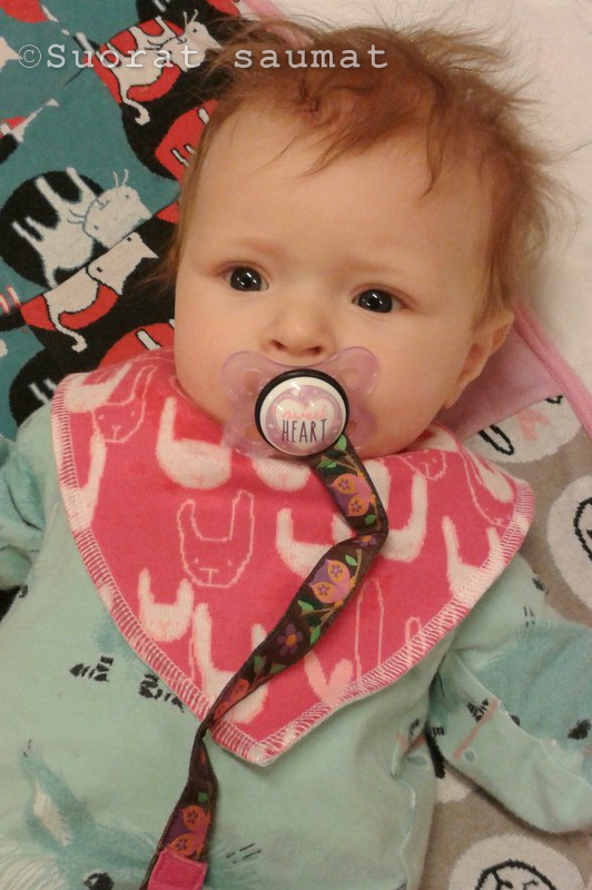 Ompelin ensimmäistä kertaa ikinä vauvalle tuttinauhan itse. Näitä tulisi 2 lisää, jos löytäisin kädenaitomessuilta Tyyne-Enterin pöydästä ostamani tuttirenkaat. Pienet ja piilossa.
